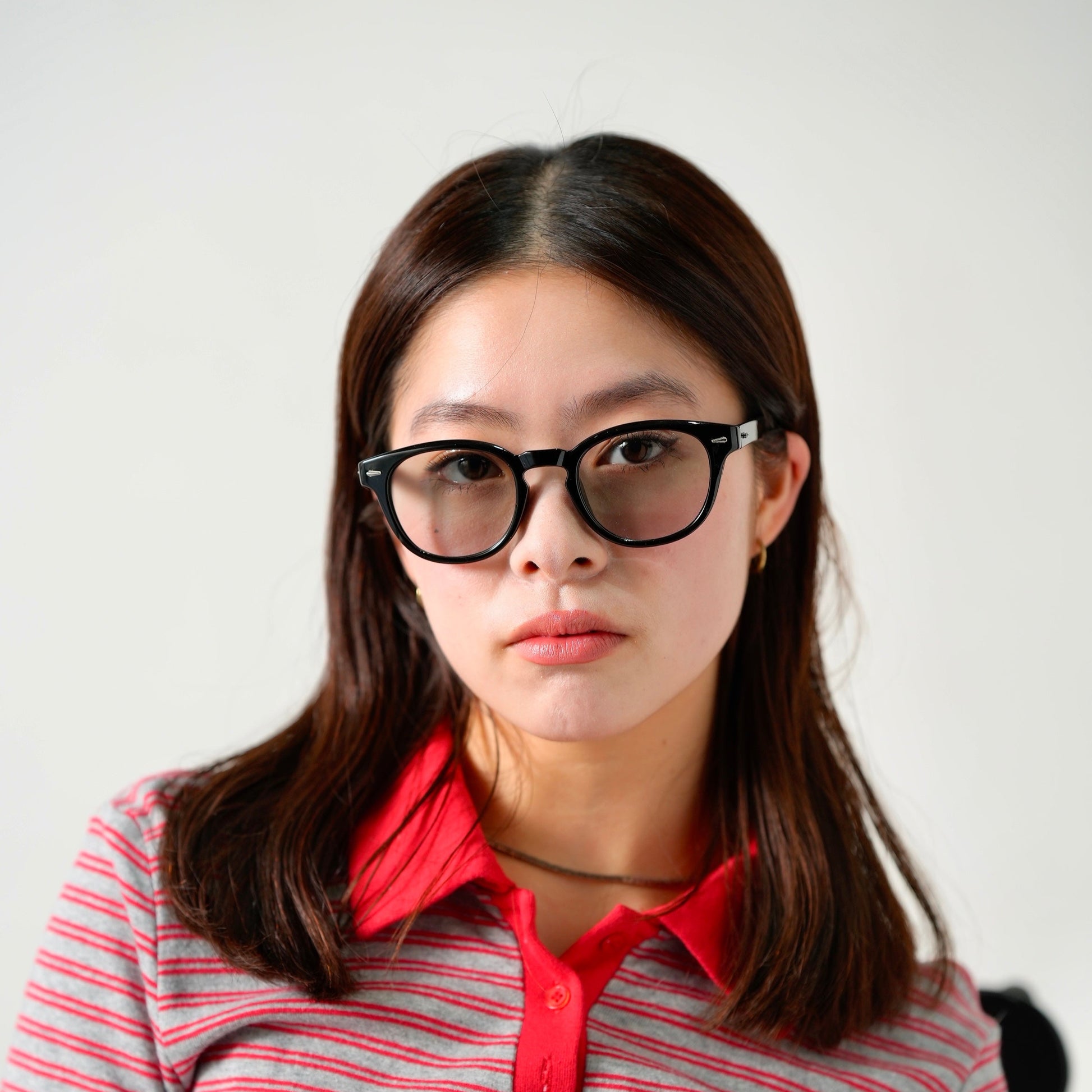 端正なシルエットが顔立ちを引き締めつつ、ライトグレーのレンズが知的で落ち着いた抜け感をプラス。