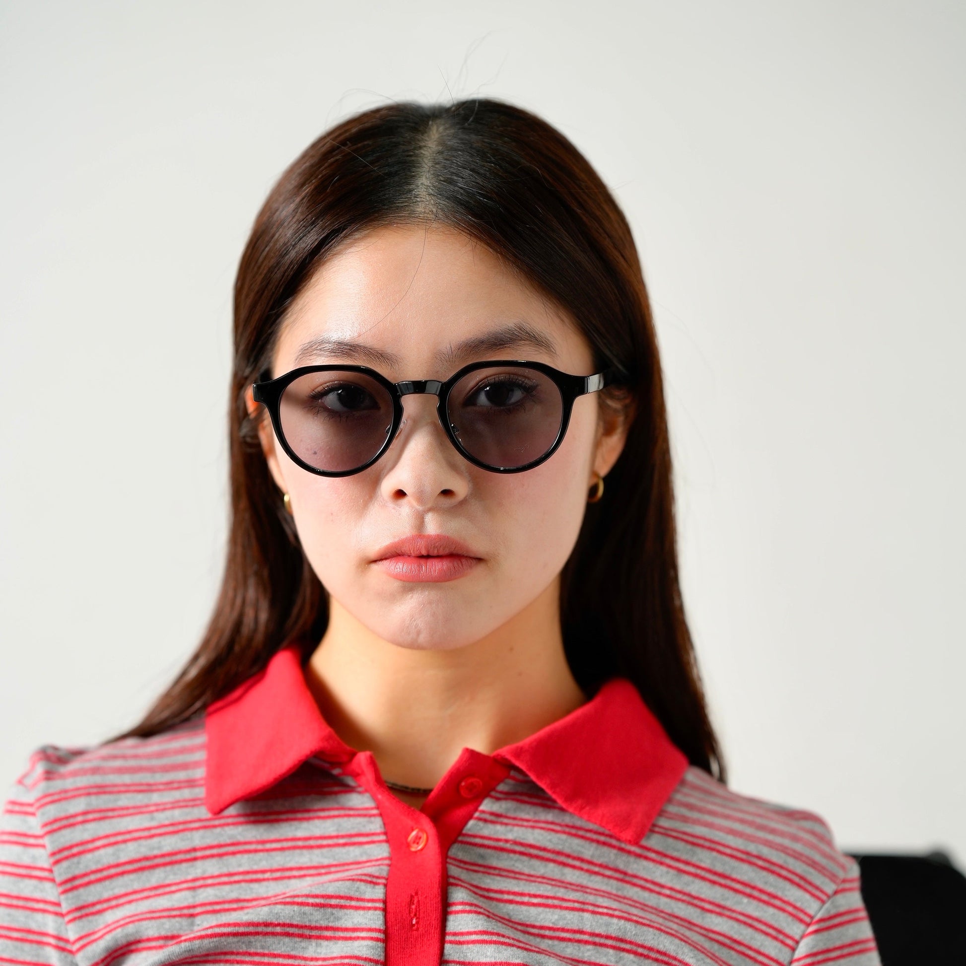 深みのあるチャコールカラーのレンズが目元を引き締めつつ、自然な陰影をプラス。
