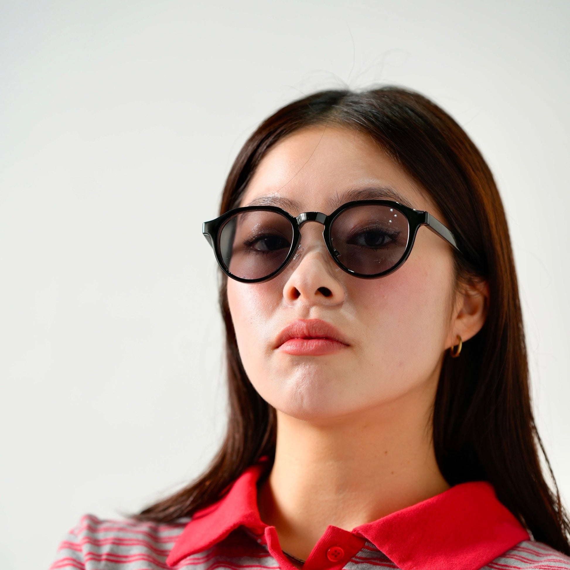 深みのあるチャコールカラーのレンズが目元を引き締めつつ、自然な陰影をプラス。