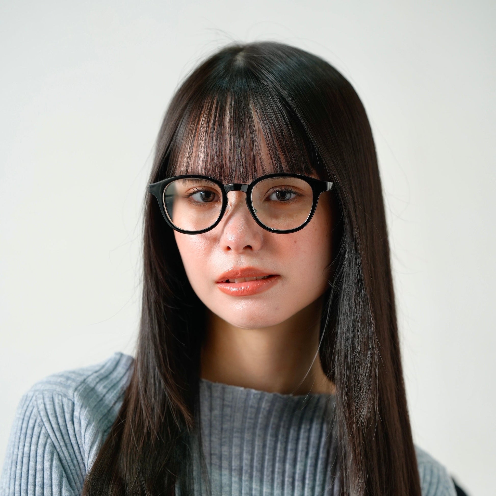 シャープなラインが顔立ちを整えつつ、クリアレンズが軽さと知的さを演出。